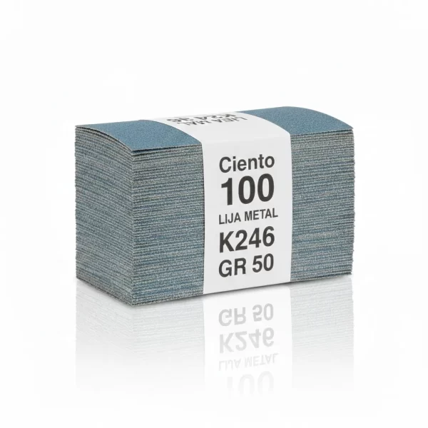 La “Ciento Lija Metal K246 Gr 50” es ideal para trabajos en metal que requieren desbaste pesado y eliminación de óxido, gracias a su grano 50 de óxido de aluminio.