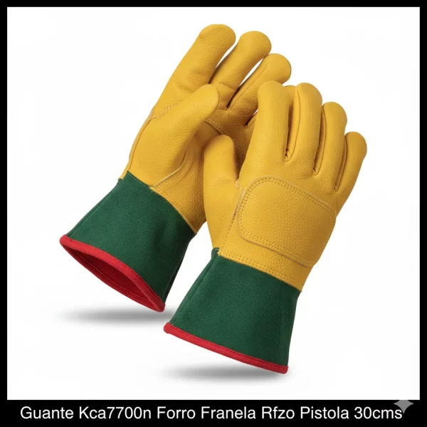 El Guante Kca7700n, con su forro de franela y refuerzo tipo pistola, ofrece una protección cómoda y duradera, alcanzando los 30 cm para mayor seguridad.