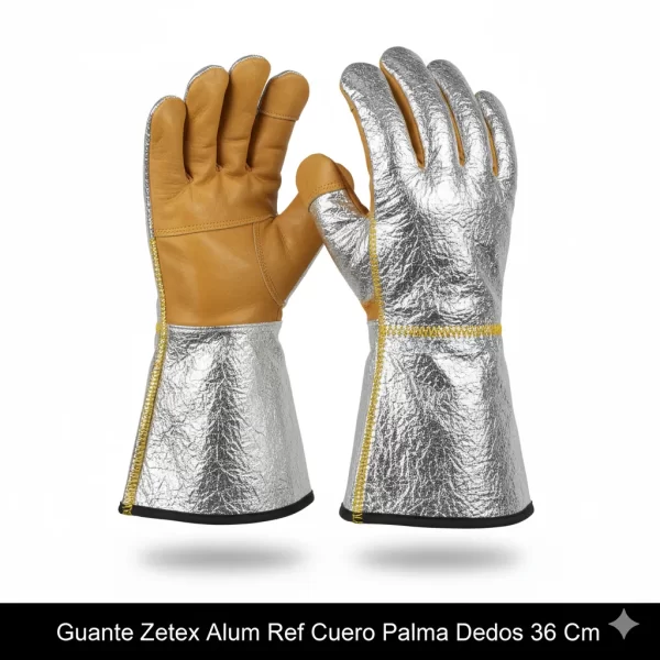 Este guante Zetex, de 36 cm, ofrece una protección superior. Su diseño combina aluminio y cuero reforzado en la palma y los dedos, ideal para trabajos que requieren resistencia y seguridad.