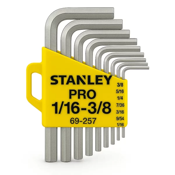 Este “Jgo 12 Llaves Allen 1.1/16 A 3/8 Stanley (69257)” incluye un set de 12 llaves hexagonales SAE, fabricadas en acero Cromo-Vanadio. Son llaves largas con punta redonda que facilitan el acople en ángulos de hasta 25°, ideales para trabajos de apriete y afloje rápido.