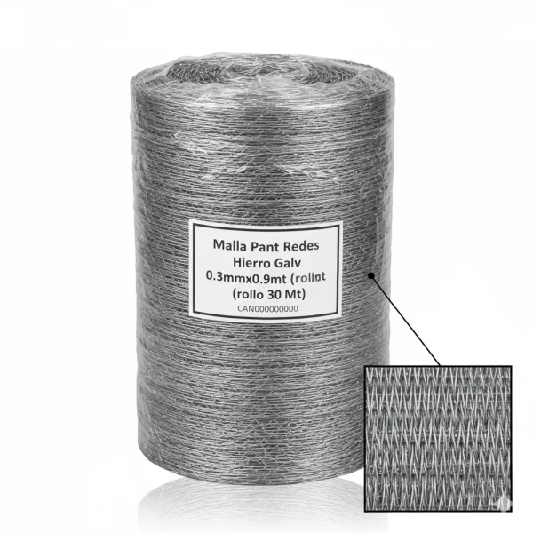 La Malla Pant Redes de Hierro Galvanizado, con sus precisas dimensiones de 0.3mm x 0.9mt, viene en un práctico rollo de 30 metros, ideal para asegurar y delimitar espacios con durabilidad y resistencia.