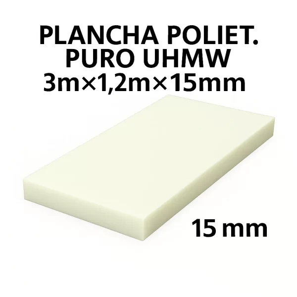 La Plancha de Polietileno Puro UHMW, con sus dimensiones de 3m x 1.2m x 15mm, es un material de ingeniería conocido por su sobresaliente resistencia a la abrasión, al impacto y su bajo coeficiente de fricción, ideal para aplicaciones industriales exigentes.
