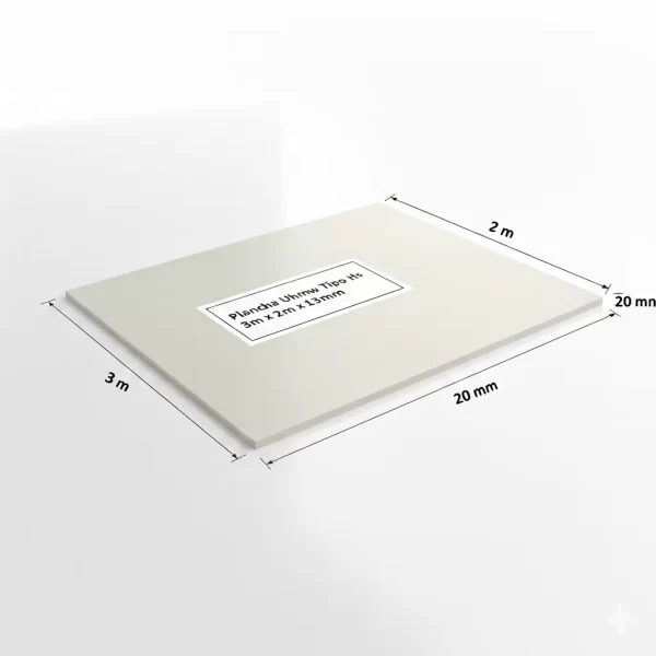 La Plancha Uhmw Tipo Hs 3mx2mx20mm, fabricada en Polietileno de Ultra Alto Peso Molecular (UHMWPE), es una placa de ingeniería robusta, ideal para aplicaciones industriales que requieren alta resistencia a la abrasión e impacto. Sus dimensiones de 3 metros por 2 metros y 20 milímetros de espesor la hacen adecuada para grandes proyectos.