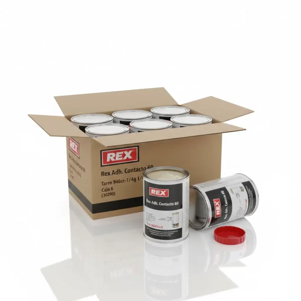 El Rex Adh.contacto 60 Tarro 946cc-1/4g (caja 6) (30290) es un adhesivo de contacto de alto rendimiento, ideal para la industria del mueble y calzado, proporcionando una unión fuerte y duradera.