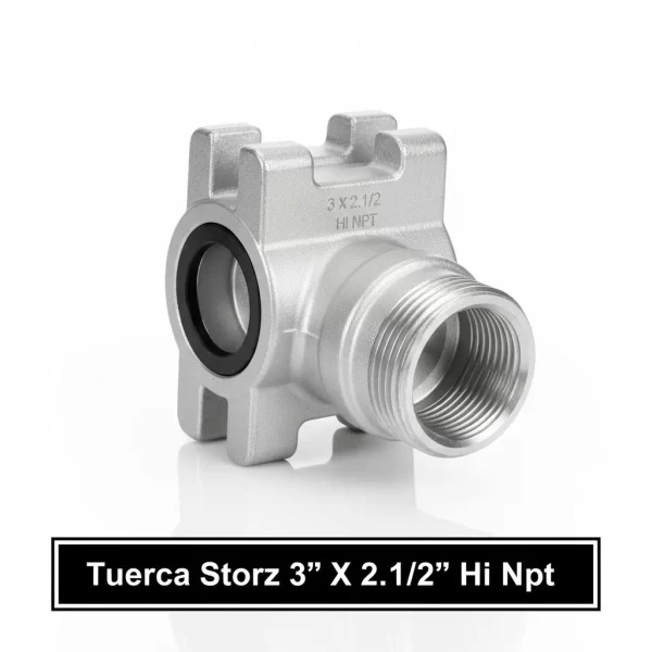 La Tuerca Storz 3 X 2.1/2 Hi Npt es un componente crucial para conectar mangueras contra incendios, asegurando un acople rápido y seguro entre una conexión Storz de 3 pulgadas y una rosca NPT hembra de 2 1/2 pulgadas.